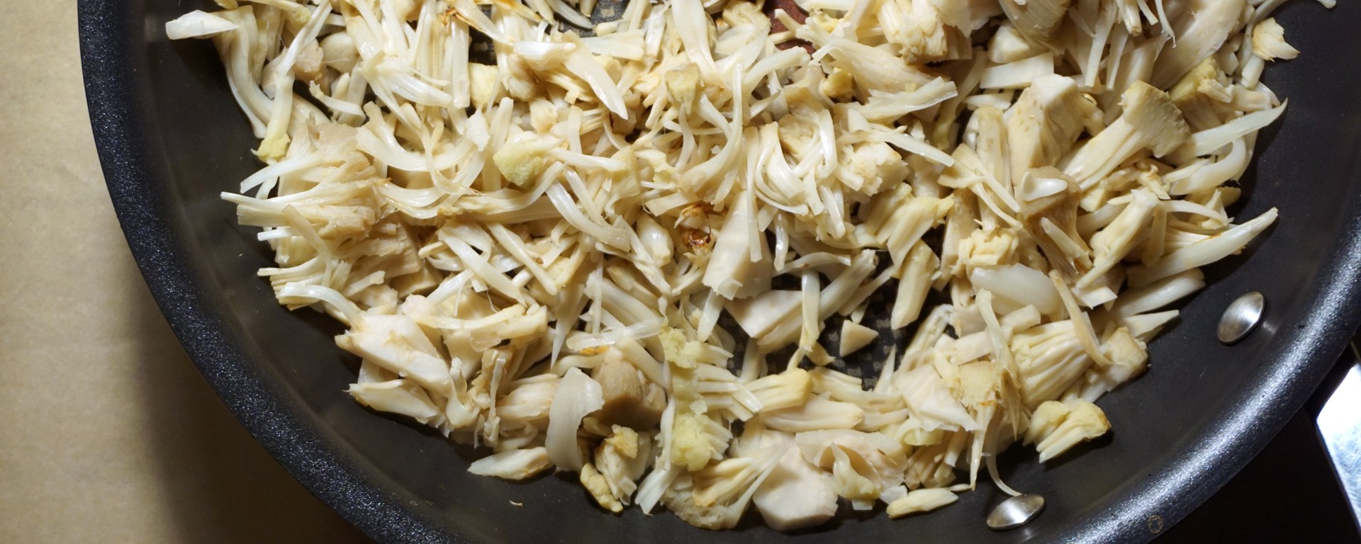 - While the mixture above is cooking, drain and rinse the jackfruit and “pull” with a knife and fork until it resembles pulled chicken/pork.