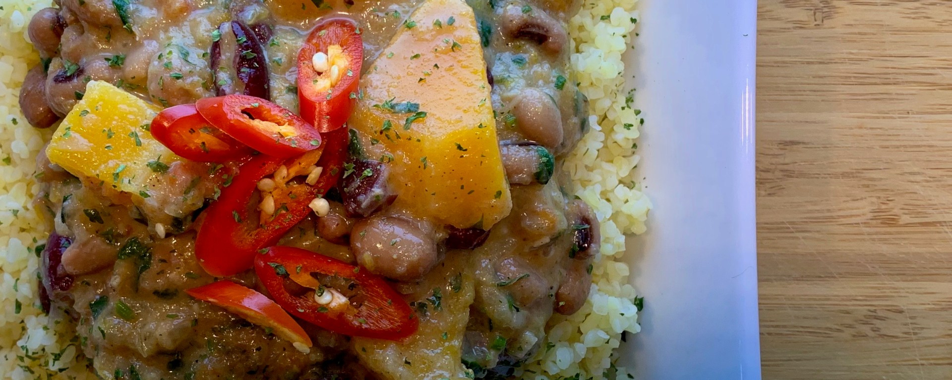 A delicious creamy Indian style recipe made with butternut squash and mixed beans. Served with bulgur wheat for a nutritious meal!
